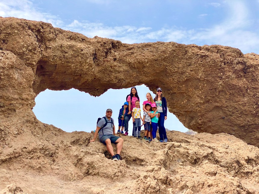 The trail has good signs and we found the arch easily. Once we got to the arch, there were people in line to use the best photo spot, so we decided to have lunch first. I told dad to come take photos of me putting my feet over the edge of the cliff. He told me to be careful, but agreed as long as we didn’t tell mommy. But I told her anyways and she didn’t actually get mad. Go mom! It was a VERY tall cliff. The little kids built a rock castle and chased lizards.