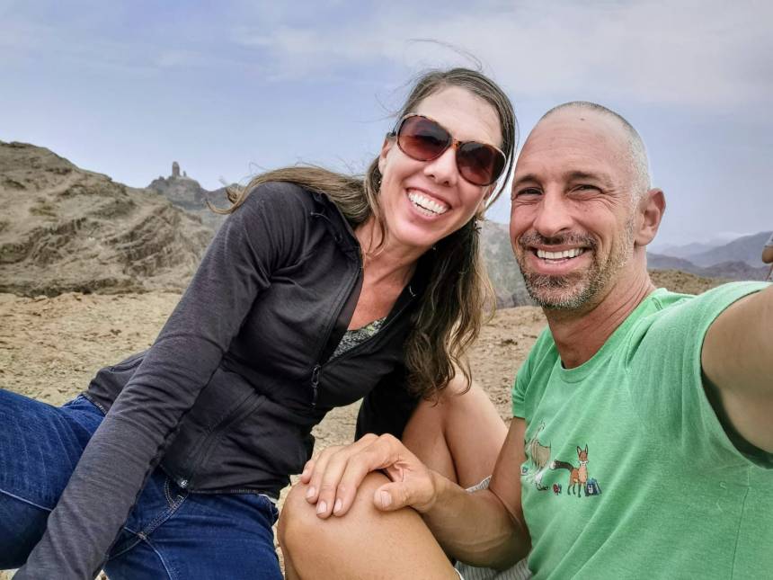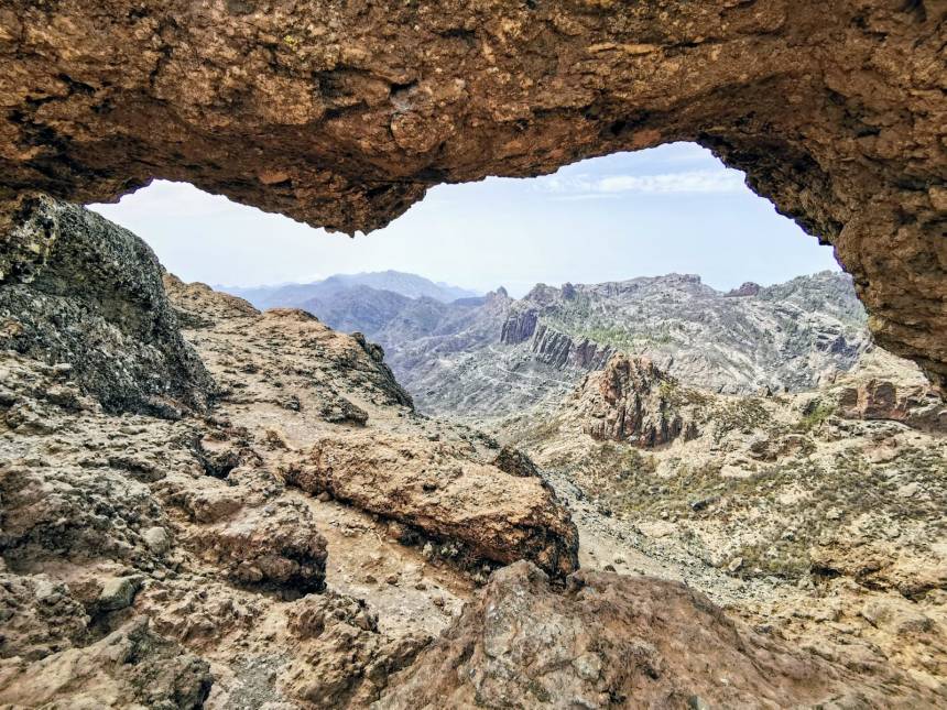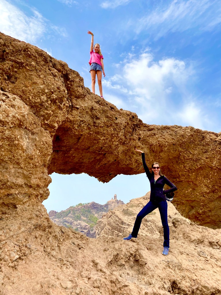 When we finished eating and playing, the arch was free for photo time. Okay, some tips. Dad climbed up on the rock across, but it turned out that wasn’t the secret spot. The best spot to take the photo, which frames Roque Nublo right in the middle of the arch, is up on the base of the arch itself to the left side. I climbed on top of the arch but the moms wouldn’t let the little kids do it.
