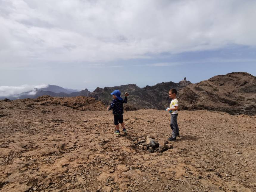 After 5-10 minutes of walking , we found a really tall rock that was perfect for climbing. It was pretty easy, even the 4 year old boy and his dad made it to the top. It them took longer than it took me, but no one was in a hurry (except the moms). Once I got to the top, I got my first peek of the Roque Nublo. It’s a giant rock that looks like a tall cloud near the very top of the mountain :). The kids and I climbed all kinds of rocks along the trail. We took our time and stopped a lot, and that made it fun!