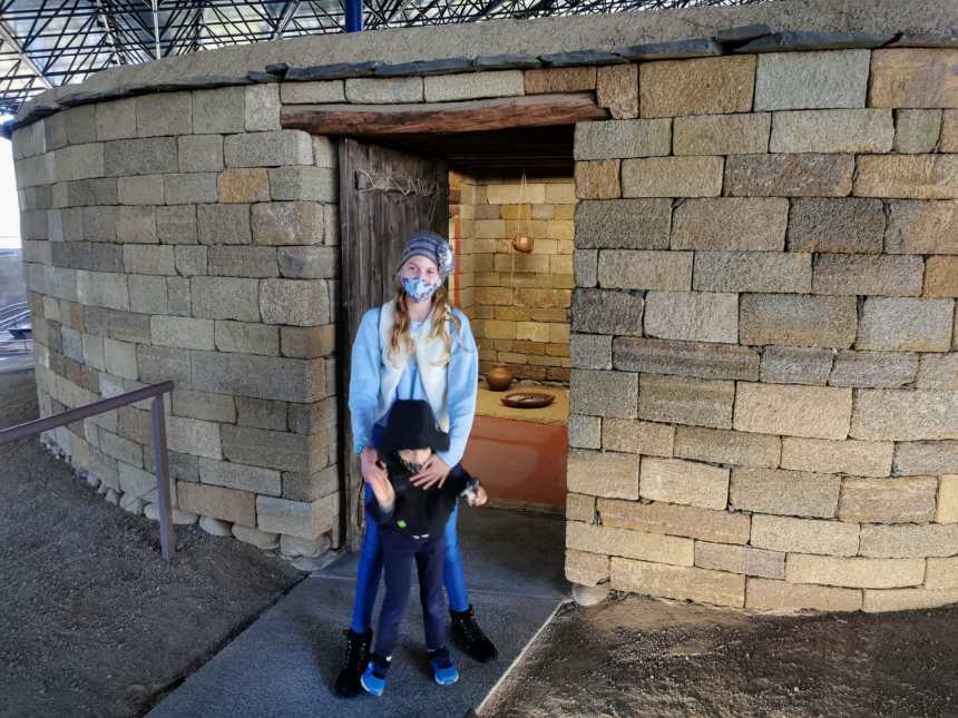 We went onto a HUGE walkway that covered the ruins of dozens of old houses. In the center of the ruins was a cave with drawings on the wall. We looked at them for 5 seconds, shrugged and moved on. More interesting were the houses you could go into. They rebuilt four houses and put the furniture inside it like the beds and the pots with plastic food. The house was kinda cozy, but I bet they were super dark without electricity and the bed didn’t look comfortable. On the roof they dried their food.