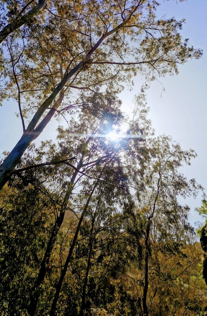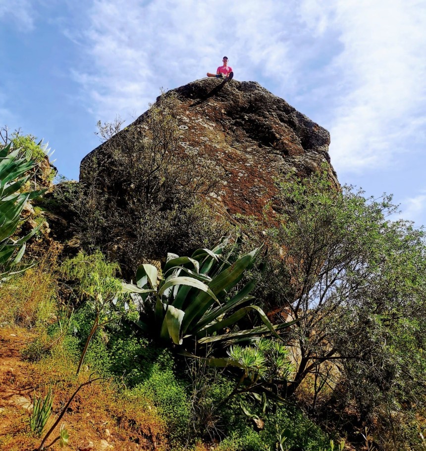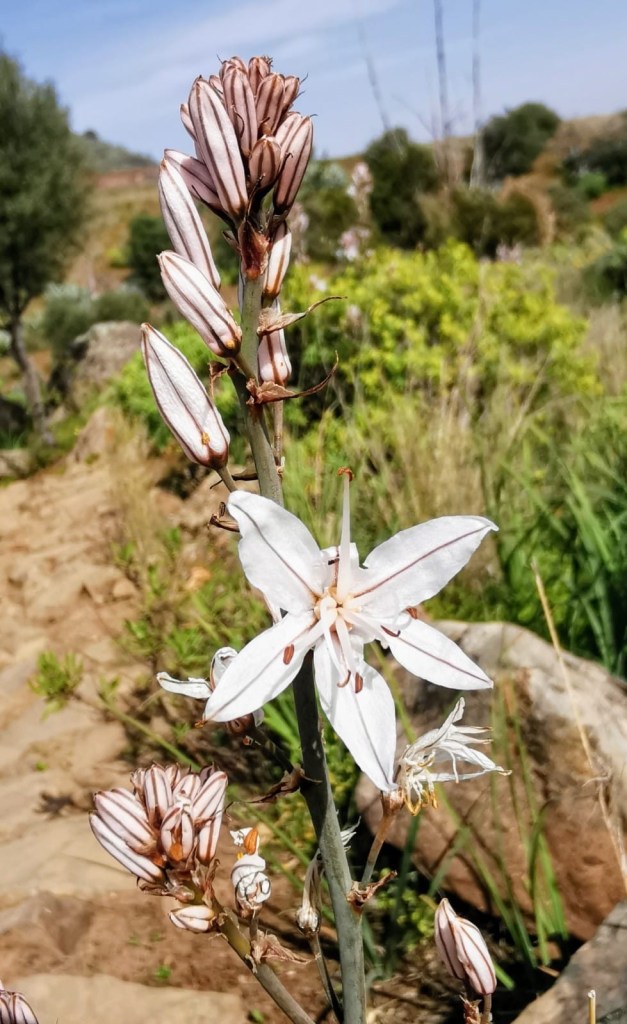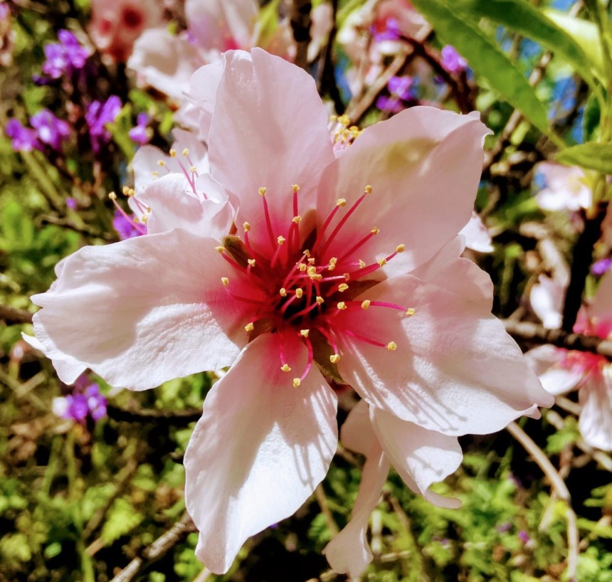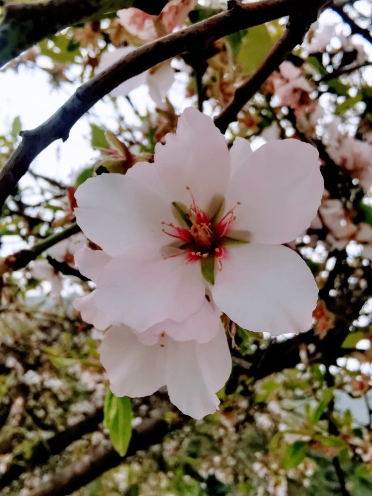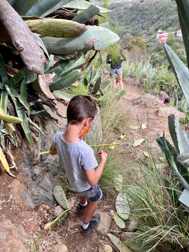 The canyon is full of green plants and boulders to scamper on. After thirty minutes, we began to climb up the side of a canyon. No almond trees yet. I was worried we missed them. Maybe we were too late in the year. It was so green in the whole valley, with huge eucalyptus, cactus, water rush reeds, and fields of grass. There were so many amazing picnic spots. This is really the right place to eat jamon, cheese, olives and enjoy the vibe and read my book while feeling the wind and sun on my back. At the top of the climb, we started to see trees in bloom. We even saw baby almonds. While most of the trees were already done, a few were covered in a blanket of soft petals. Sojourn wanted to be a hunter so we made him a spear out of bamboo:)))))