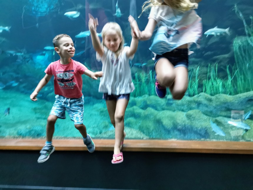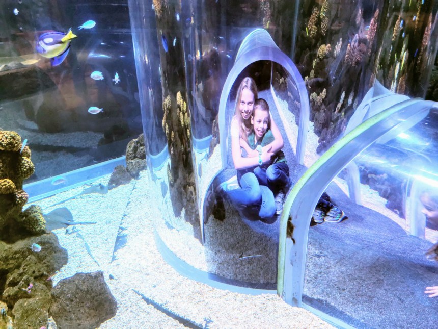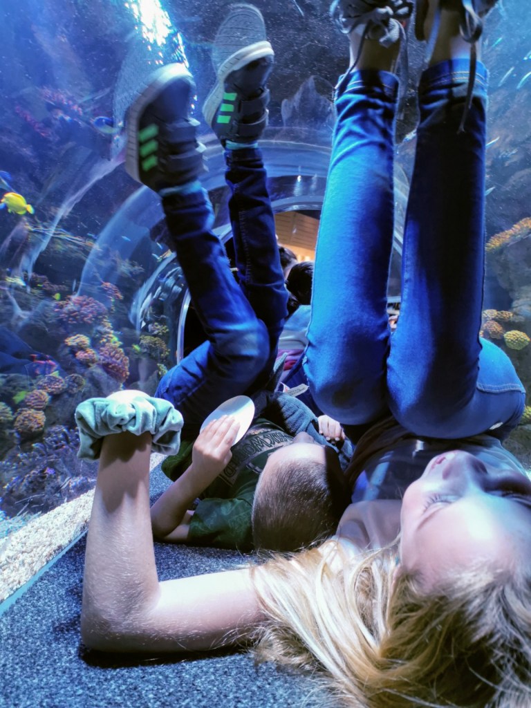 They have a nice little café where the adults sit, or we use the bathroom next to a cool play area. The kids and tiny adults crawl into a small glass tunnel and all around are the fish from finding nemo. Clown fish, damselfish, tangs, puffer fish, sea stars, sea anemones, and sometimes there is even a baby shark. I’m not sure why, but it doesn’t get old.