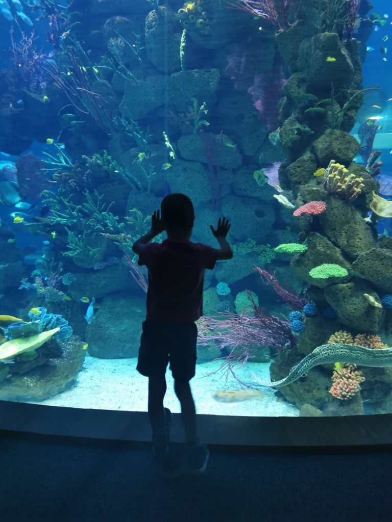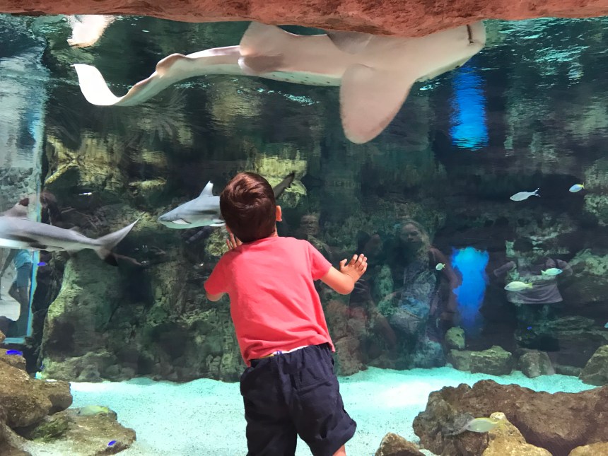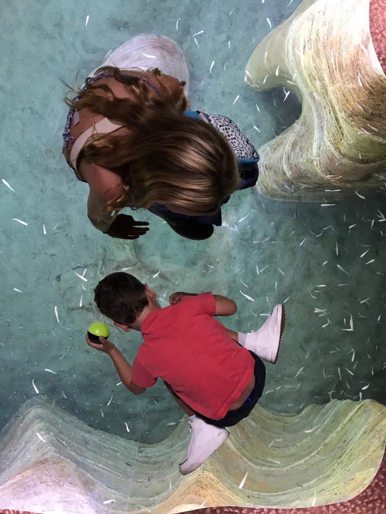 Below the café, down a big twisty ramp, is a tall circular tank surrounded by bean bags. It’s a dark quiet space where I like to read a book out loud with dad and look at the fish. Sojourn likes it when we pick out a fish and he has to run around until he finds it. The tank is a piece of art. There is a tower of coral like a vibrant living rainbow topped by a cute island you can see from above. Sojourn loved chasing the sting rays. I think the small sharks are beautiful. This is the best place to just take some down time.