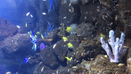 Well, that sounds like an obvious combo right? But, this is a poem of the ocean, and not an encyclopedia of the ocean. So it’s not organized alphabetically but by habitat. That means, where things live. At the top of the escalator are piranhas. They can eat a whole cow. But the tiger fish with its enormous teeth looks scarier. There are tropical plants and huge stone pointy things that make me feel like I’m in the jungle. The ceiling is 20 meters high. It is so big.