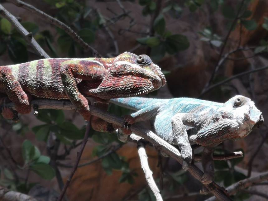Up in the trees are chameleon lizards and in their shade sit tortoises. The lizards are cool because they change colors to blend into the tree and have wacky eyes that look at you.