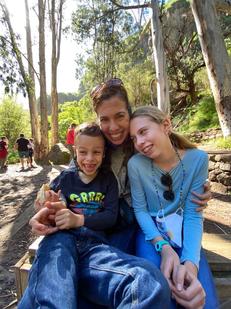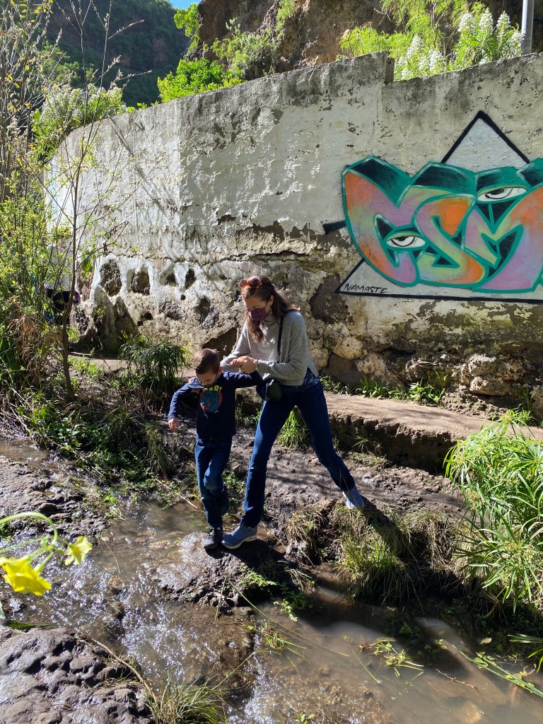 After we completed the mini “river” trail we arrived at a small picnic area, where we had a quick snack before heading to find the waterfall. Lots of tables under huge eucalyptus trees full of little kids. I counted over 50 kids with families. The picnic space is super popular. It’s a 10-15m walk to get there, just right for littles. It looks like a great place to go on hot days to hang out and play in the shade.