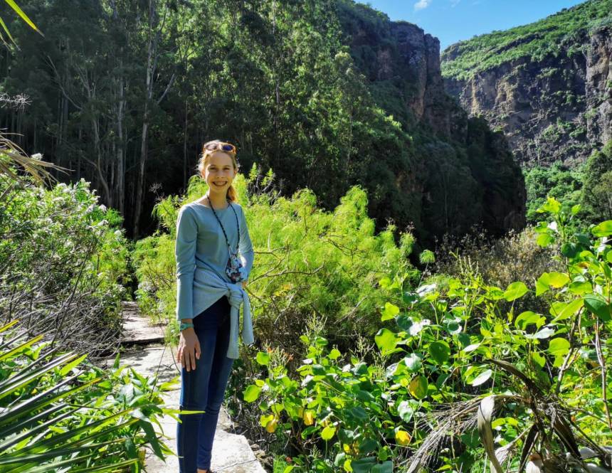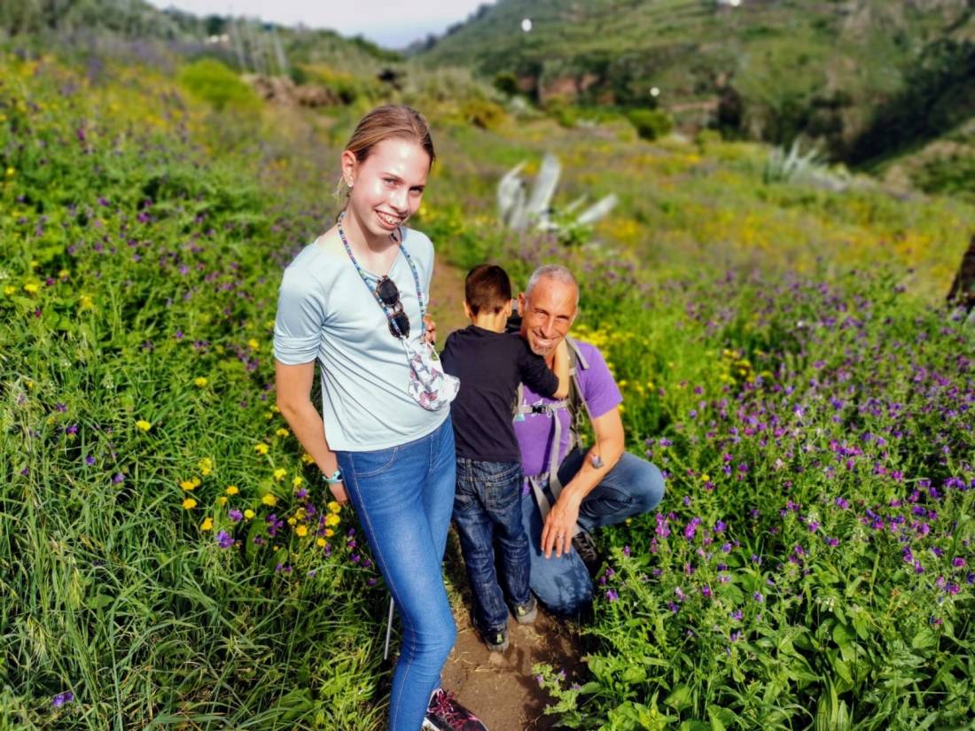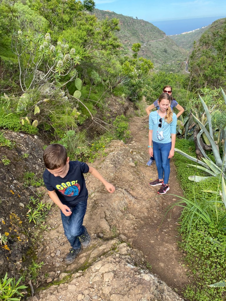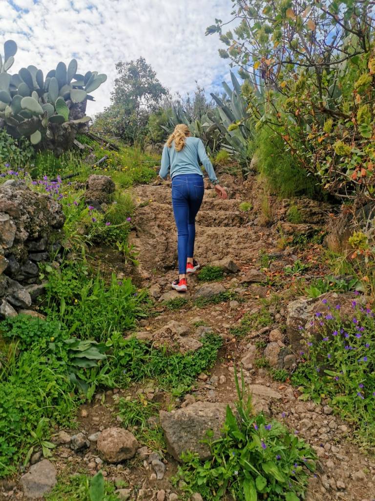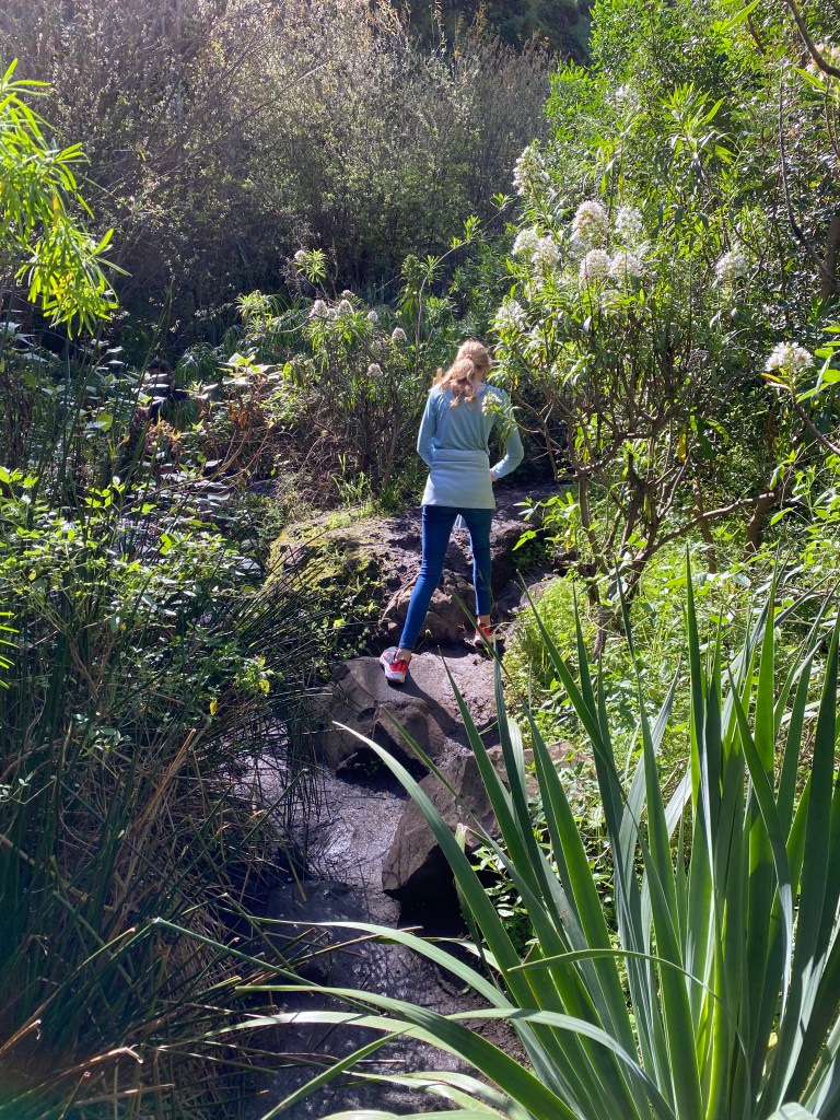 It has been raining for weeks. Wet, wet, wet. Which is not normal, as we live on a desert-ish island. Everything is so green right now and it’s beautiful. Flowers in all directions. When we started out, the trail was pretending to be a small river. I don’t think it is normally like this. We had to jump from rock to rock but that still didn’t stop my shoes and socks from getting wet. It’s pretty flat and made of cobblestones, but there was a small dirt path on the upper bank.