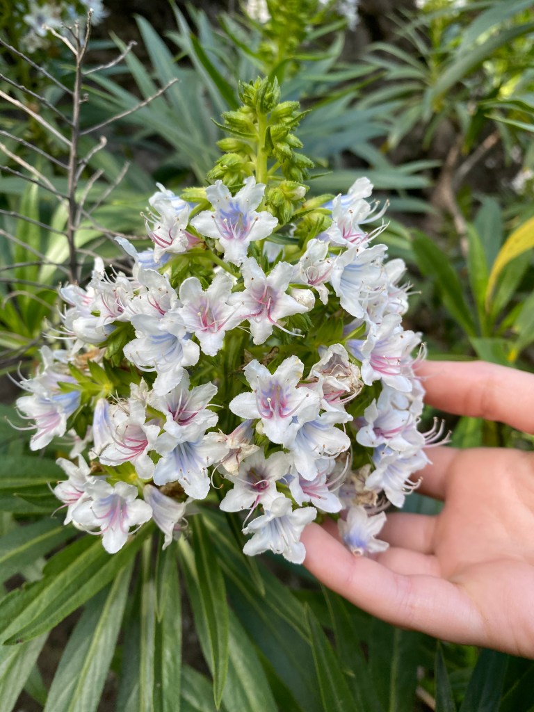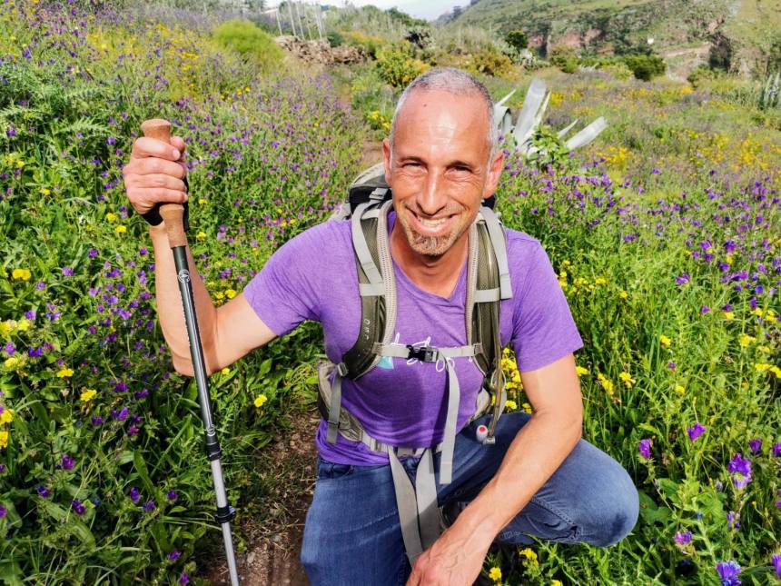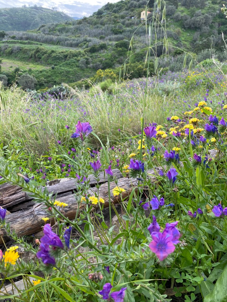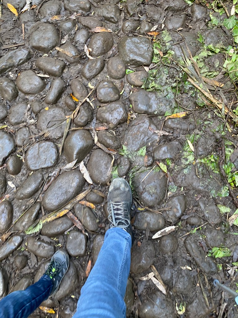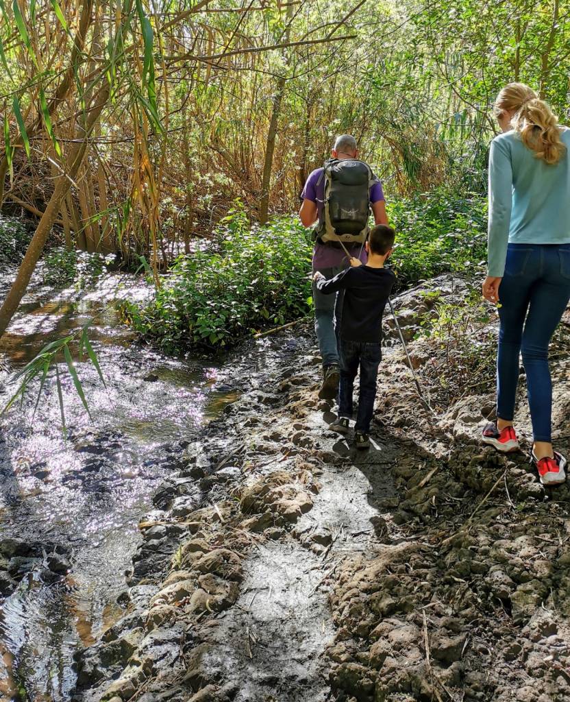 It has been raining for weeks. Wet, wet, wet. Which is not normal, as we live on a desert-ish island. Everything is so green right now and it’s beautiful. Flowers in all directions. When we started out, the trail was pretending to be a small river. I don’t think it is normally like this. We had to jump from rock to rock but that still didn’t stop my shoes and socks from getting wet. It’s pretty flat and made of cobblestones, but there was a small dirt path on the upper bank.