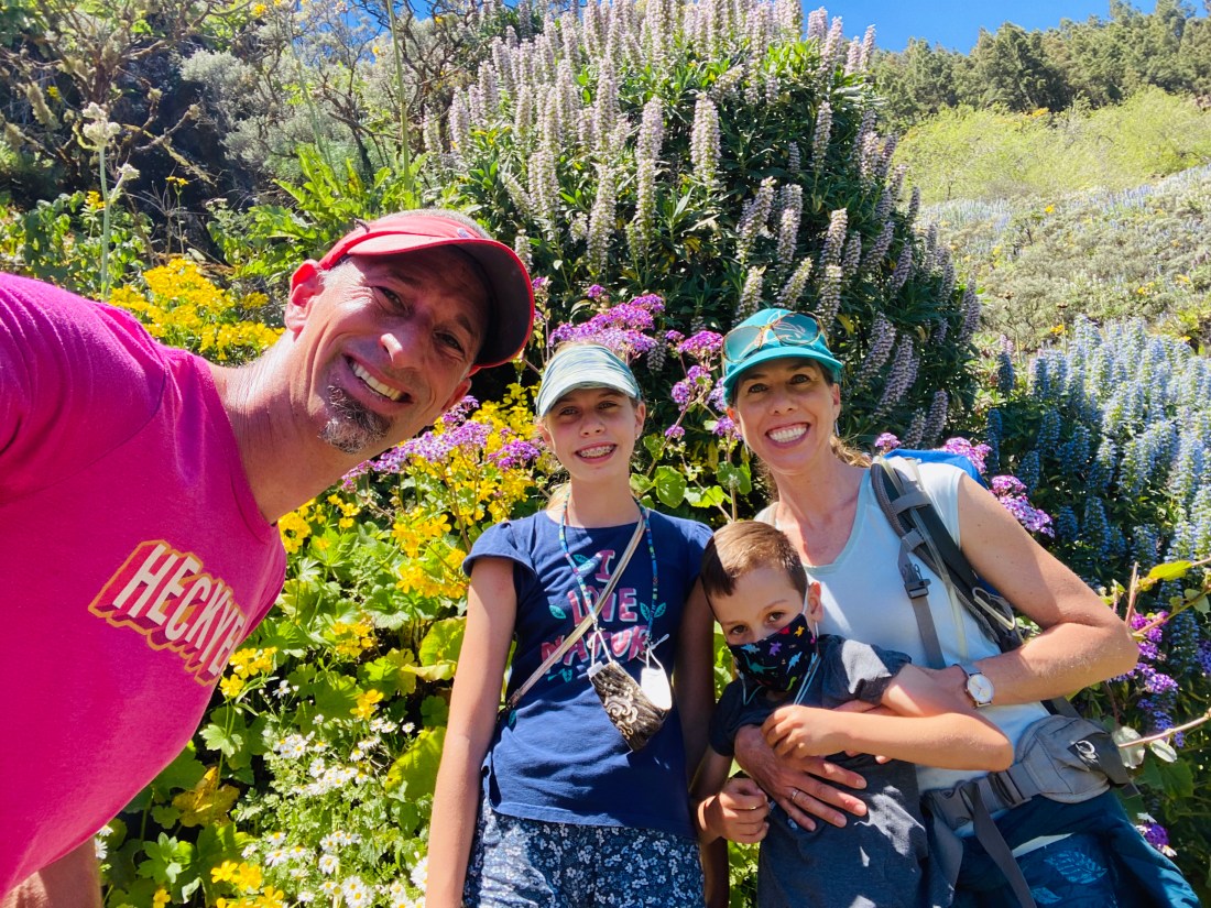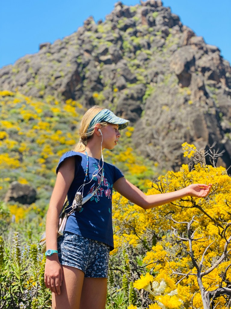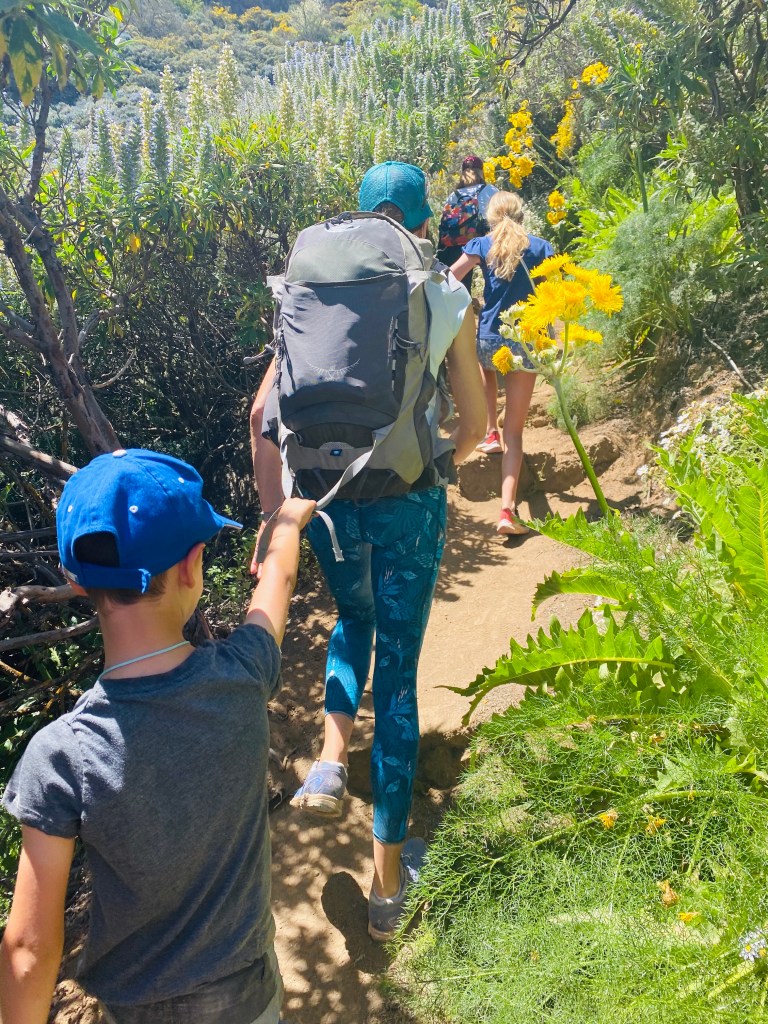 I asked dad to help me explain the trail because there are options. The trail we choose starts right at the viewpoint of the Caldera de Los Marteles. The big hole from the volcanic explosion made Sojourn excited and he kept yelling Boom. From there it is 6km downhill to Tenteniguada. We were thinking of having friends leave a car there, then drive up with us to park at the top and just walk the whole trail down hill so us kids wouldn’t have to do a huge climb. But with Covid and the number of people it didn’t work. So, instead we all parked at the top, and just walked for 45m, had a picnic and strolled back up.