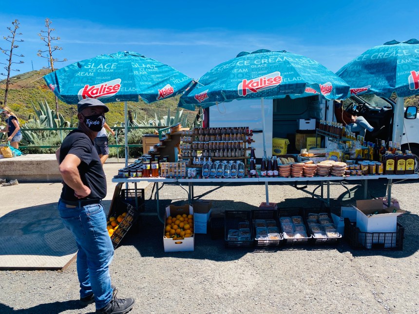 At the lookout over the Caldera de Los Marteles is a couple selling fruit, jams, honey, sandwiches, cheese, nuts and drinks. We got strawberry juice and atun indio (cactus fruit) juice. They were delicious and we even got some extra for home. We also got Sojourn some almonds (which I didn’t like) and some mango jam. The oranges and the honey were good (we got to try samples). I’d still pack a picnic in case they aren’t there, but take advantage if you get lucky.
