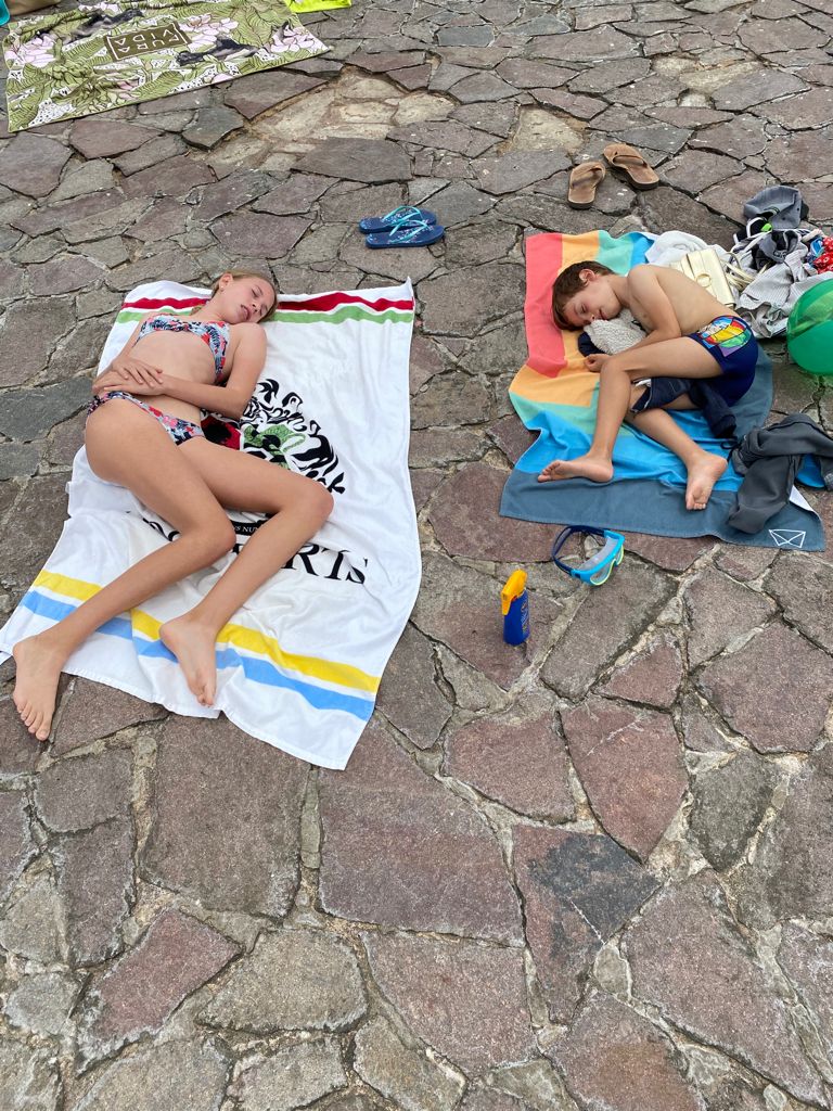 There wasn’t any sand by the pools. Everyone was stretched out on a big stone patio. Lots of people brought chairs and umbrellas. Bring a bit of extra padding if you plan to camp out for a while. And hats and water. There is no shade. Sojourn and dad played football there for a while with a beachball. There were a lot of kids even though it was still morning. The restaurants were super busy, so I recommend you book ahead.