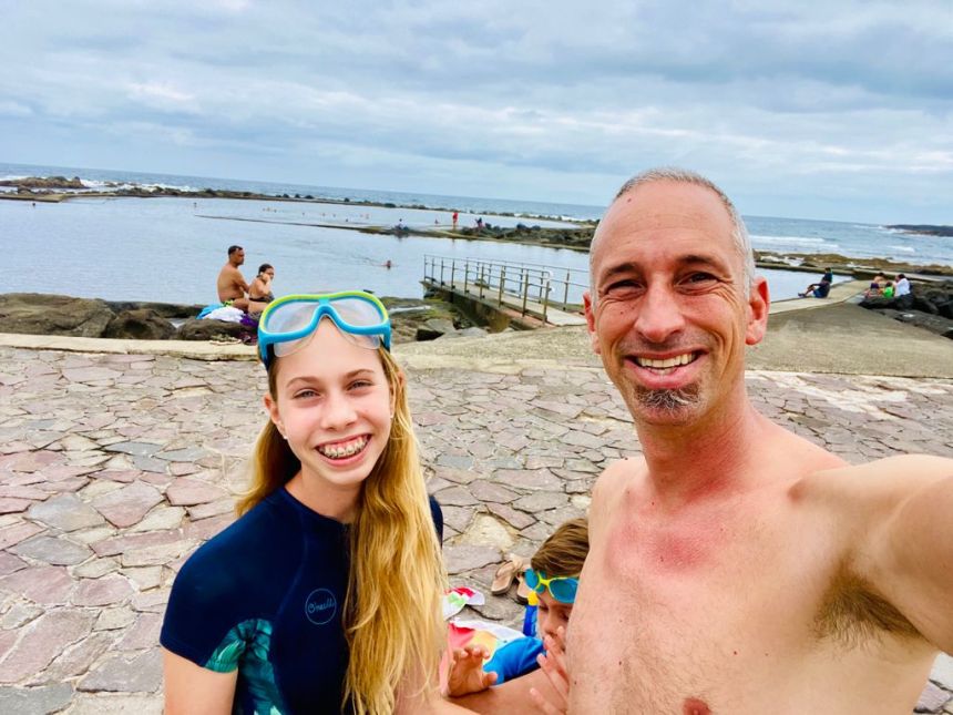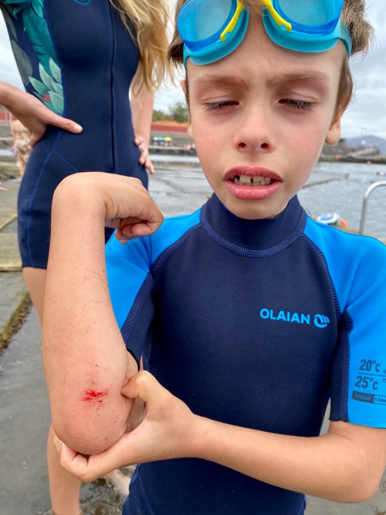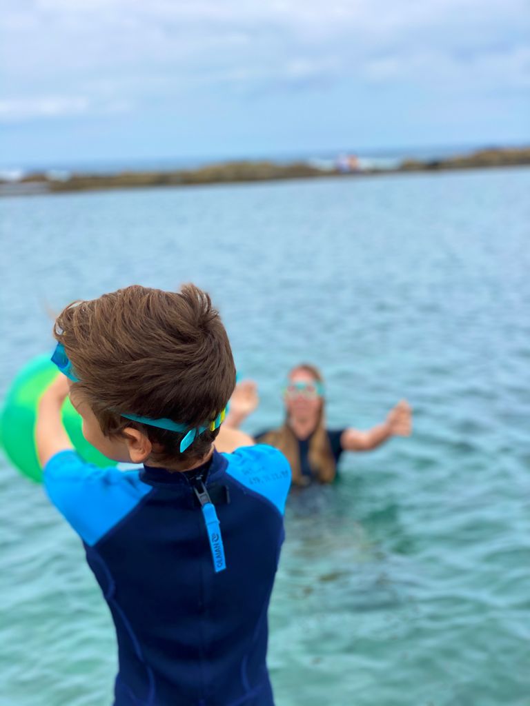 We walked from the salt pools to a small playground on the other side of the cove. It had swings, and a couple other structures. Nothing fancy. Just past the playground is a sand beach which is super protected from the waves and wind. We haven’t hung out there yet but dad is excited to go with us on a day where the surf is good.